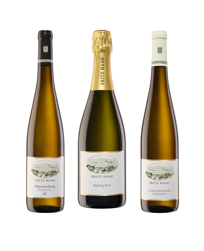 Diese drei Weine können ein ganzes Menü begleiten. Zum Start unser Riesling Sekt mit über 60 Monaten Hefelager, dann zum Hauptgang ein GG aus dem Paulinshofberg, mit dunklen Fruchtaromen und feiner Würze. Zum krönenden Abschluss dann die Sonnenuhr Auslese, welche vom VINUM Weinguide zur Auslese des Jahres gekürt worden ist.